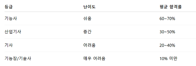- 기능사: 입문용, 누구나 도전 가능 (17세 이상이면 응시 가능)
