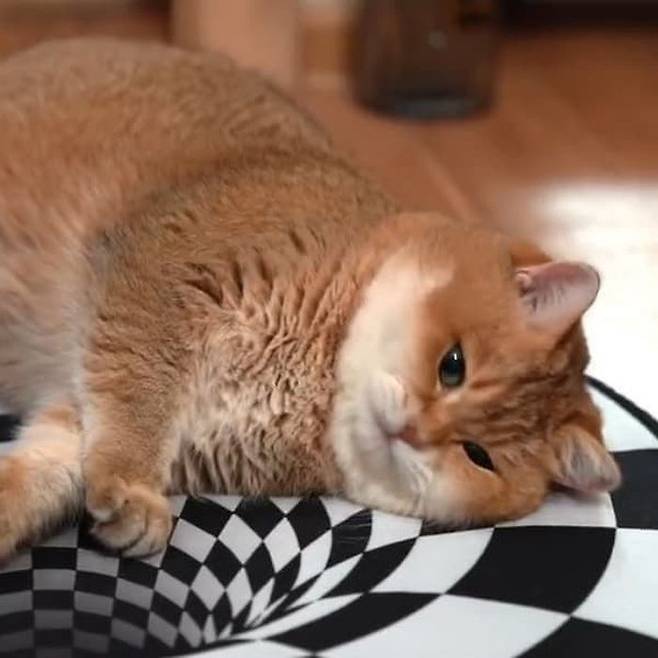 독특한 무늬로 마치 안으로 빨려 들어갈 것만 같은 착각을 불러 일으키는 착시 매트인데요. 과연 고양이는 이를 보고 어떤 반응을 보였을지 궁금합니다.