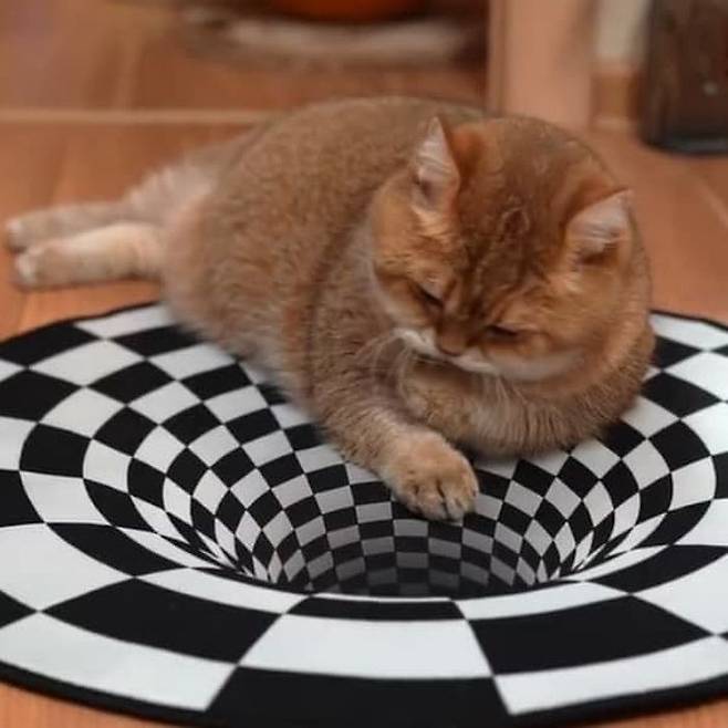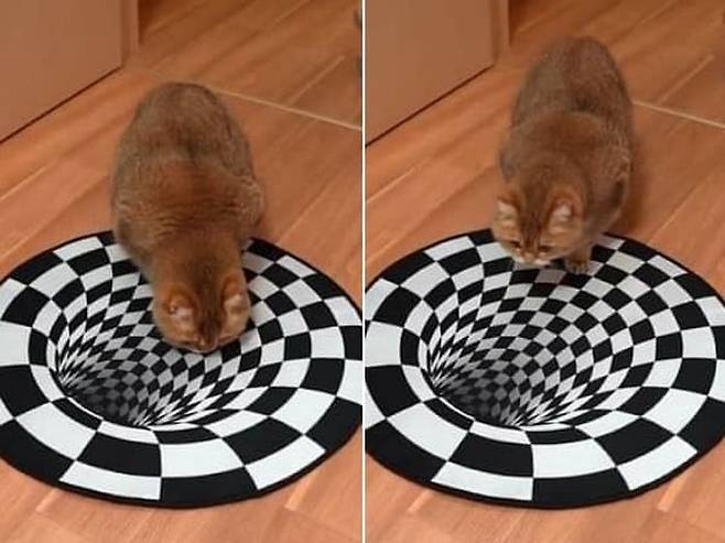 만약 바닥에 착시 매트를 깔아 놓았을 때 고양이는 어떤 반응을 보일까. 여기 실제로 착시 현상을 보이게 만드는 착시 매트를 바닥에 깔아 놓은 집사가 있습니다.