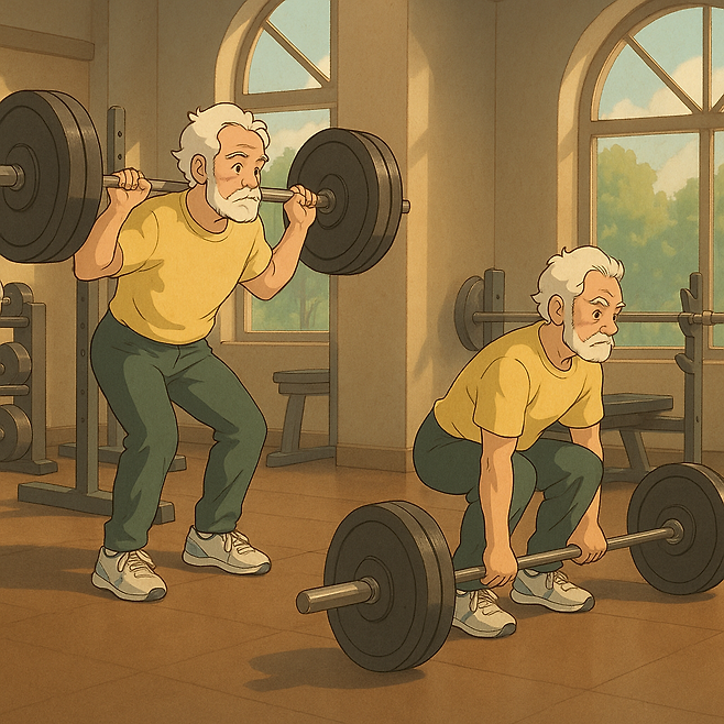 1️⃣ 근력(월·수·금) : 스쿼트·데드리프트·벤치프레스 3세트 × 10 reps