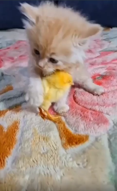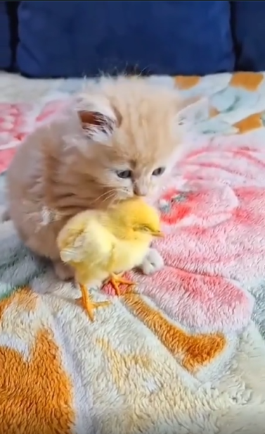 병아리는 고양이의 앞발에 살짝 맞고도 무서워하지 않고, 오히려 옆으로 톡톡 걸어가며 나름의 반응을 보여줍니다. 그러자 고양이도 놀라지 않도록 움직임을 멈췄다가, 다시 아주 천천히 뒤따라갑니다. 이 둘 사이에는 말 대신 몸짓으로 오가는 작고 조심스러운 소통이 흐르고 있습니다.