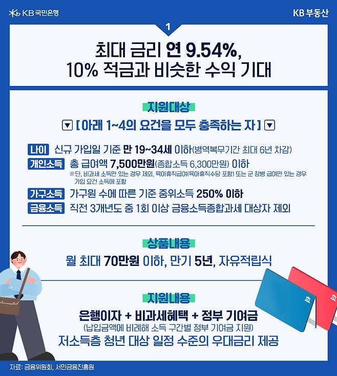 가입 조건은 계좌 개설일 기준 만 19세~34세 이하, 직전 과세 기간 개인소득 총 급여 7,500만원 이하여야 합니다. 만약, 총 급여 2,400만원 이하 가입자가 월 70만원씩 5년간 가입했다고 가정하면 만기 때 5,061만원을 탈 수 있습니다. 총 급여가 3,600만원 이하이면 만기 시 최대 4,981만원을, 4,800만원 이하는 최대 4,956만원을 받을 수 있습니다.