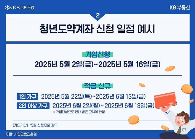 5월 기준으로 보면, 5월 2일부터 16일까지 신청을 받고 심사를 통과 후 1인 가구는 5월 22일부터 6월 13일까지, 2인 이상 가구의 경우 6월 2일부터 13일까지 가입할 수 있습니다.