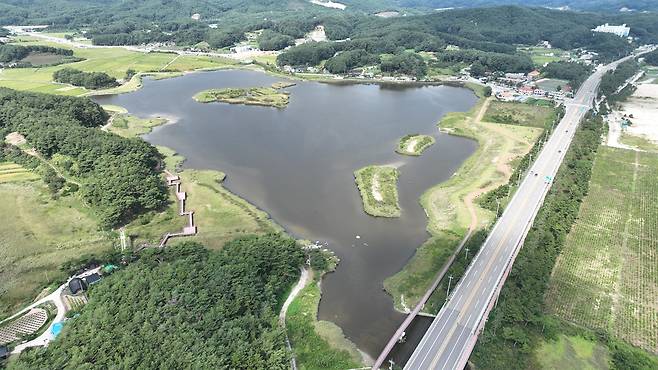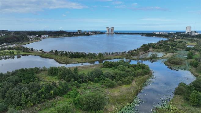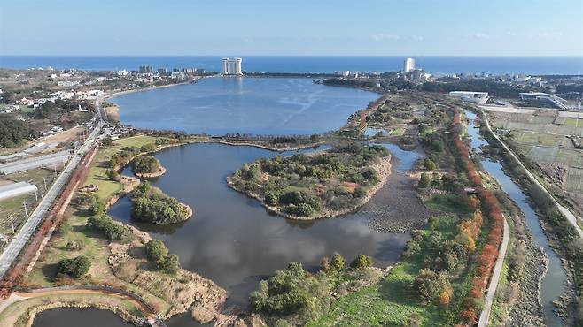 | ▲ 경포호와 습지 1966년 실시된 경포천 및 안현천의 유로 변경과 호안공사로 현재와 같은 모습을 갖추게 됨 |