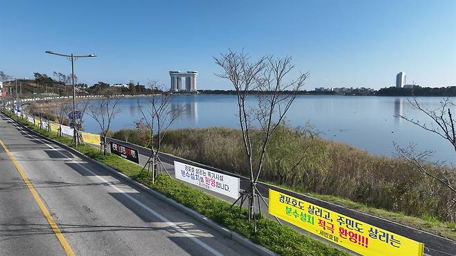 최근 강릉시가 악화된 경포호수의 수질을 개선하기 위해 호수 내에 물 순환 시설과 대형 분수를 포함한 수중 산소공급 장치를 설치하기로 하면서 논란이 불거졌다.