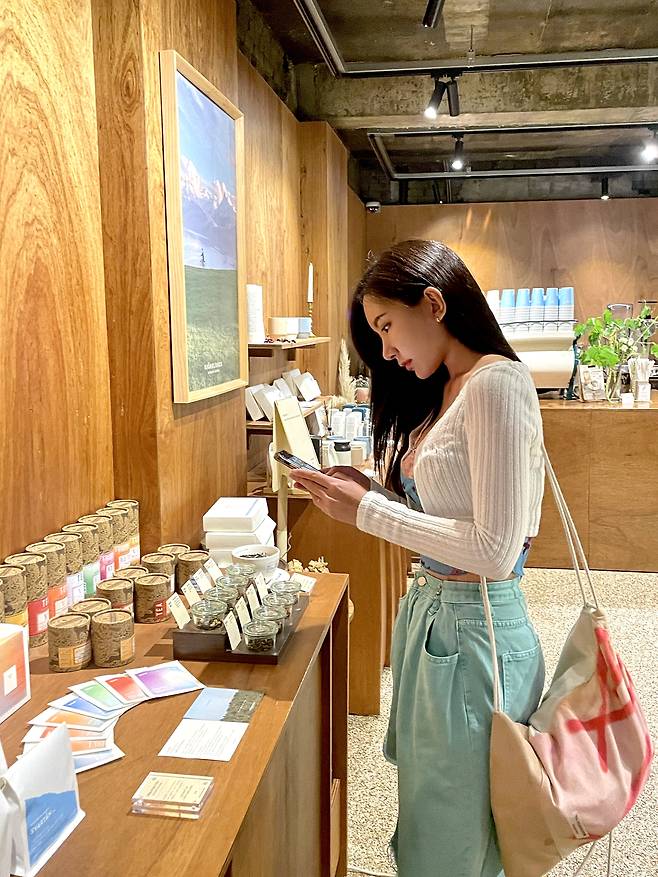 민트 와이드 팬츠로 포인트를 줘서 더 힙하게 연출해 볼 수 있어요~