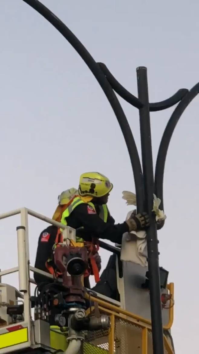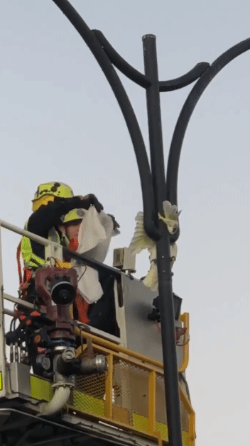 소방대원들이 이 앵무새를 구하기 위해 조심스레 접근 중인데요.