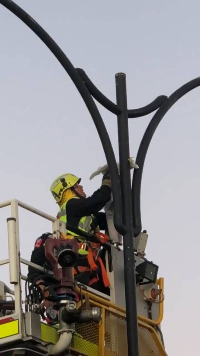 앵무새 한 마리가 가로등 구조물 사이에 목이 끼어버렸습니다.