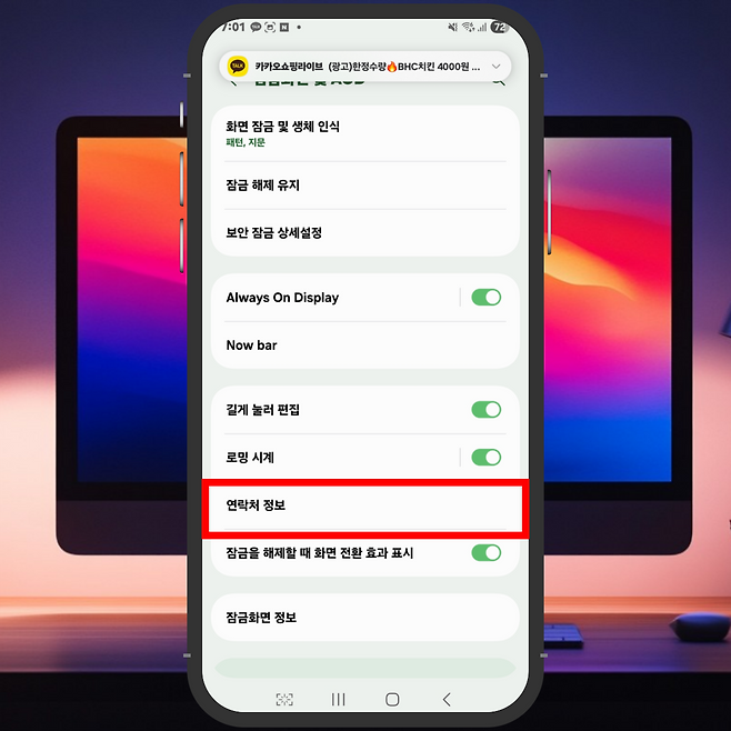 '잠금화면 > 연락처 정보' 항목을 확인해보세요.