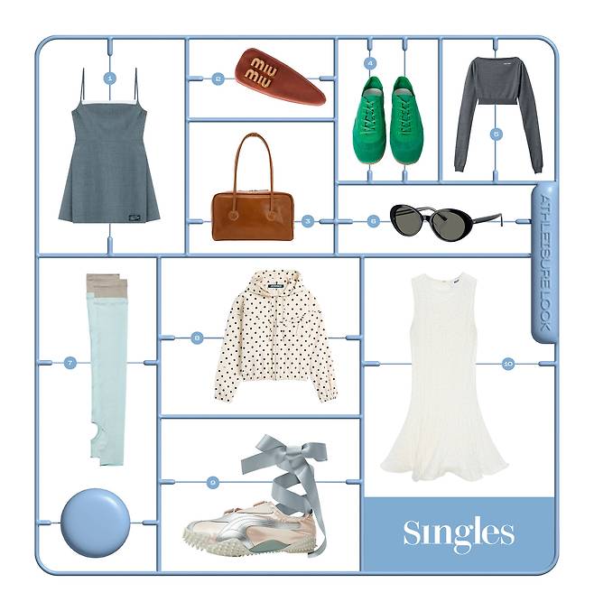 습기 머금은 한여름이 오기 전에 부지런히 한강공원에 나가 산뜻한 공기를 마셔겠다고 생각하는 사람이 많을 거다. 잔디밭에서 내내 일광욕을 즐길 게 아니라면, 오전에 카페에 들러 커피도 좀 마시고 일광욕 후 저녁 데이트까지 예정해뒀다면 나름 계산된 복장으로 집 밖을 나서야겠지. 이럴 때 애슬레저 룩이 적당한 처방이 된다. 가벼운 아노락 점퍼 혹은 윈드브레이커는 필수! 여기에 활동하기 불편하지 않은 길이의 미니 원피스를 믹스매치하고, 미우미우의 2025 S/S 시즌 런웨이를 답습해 얇은 보트넥 스웨터를 튜브 톱처럼 레이어링한다.(기온이 내려가는 저녁에는 이 스웨터가 보온 역할을 톡톡히 해낼 거다.) 감히 힐에 도전할 생각은 없다. 유행 대열에 오른 레트로 스니커즈나 리본 스트랩을 체결한 푸마의 스니커즈로도 충분히 편안하면서도 걸리시한 분위기를 낼 수 있으니! 텀블러나 간단한 스낵류 등을 담기에는 낙낙한 크기의 볼링 백이 적당하다. 데이트 상대도 고려하면서 무엇보다 편안해야 한다면 주저 없이 페미닌한 애슬레저 룩으로 무장해 집 밖을 나서겠다.