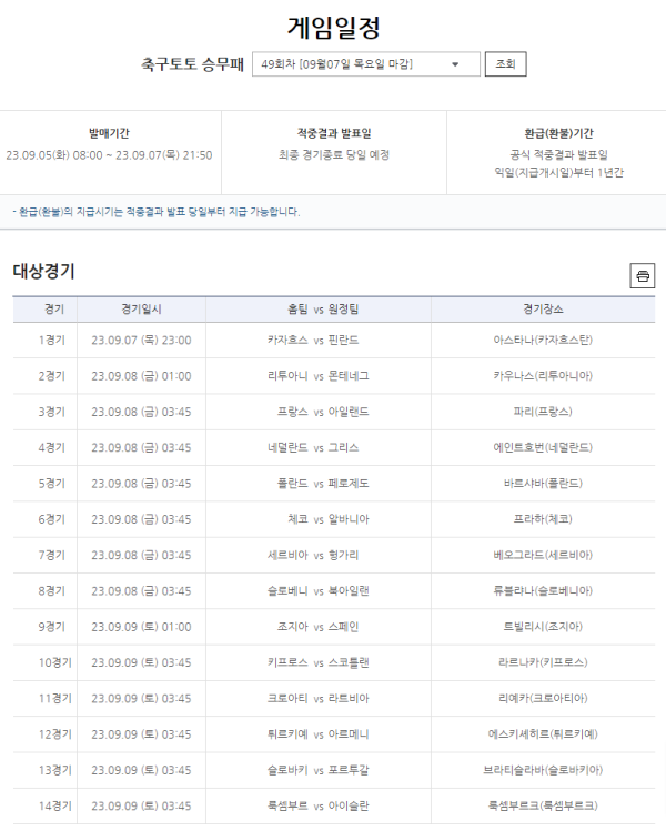 오는 9월 5일 오전 8시부터 축구토토 승무패 49회차 발매 개시