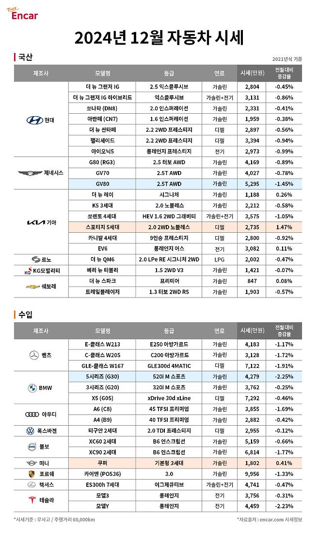 자동차 거래 플랫폼 엔카닷컴이 2024년 12월 중고차 시세를 공개했다. 이번에 공개된 중고차 시세는 엔카닷컴 빅데이터를 토대로 현대자동차, 기아, 르노코리아자동차, KG모빌리티 등 국내 완성차 브랜드와 벤츠, BMW, 아우디 등 수입차 브랜드의 2021년식 인기 차종 중고차 시세를 분석한 결과다. 주행거리 기준은 60,000km이며 무사고 차량을 대상으로 분석했다.