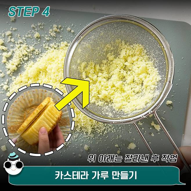 카스테라 윗부분과 아랫부분을 잘라내 주세요. 그 뒤 남은 가운데 부분을 채에 걸러 고운 가루로 만들어줄 거예요. 느낌 RGRG?