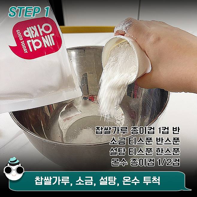 STEP 1 찹쌀가루, 소금, 설탕, 온수 투척