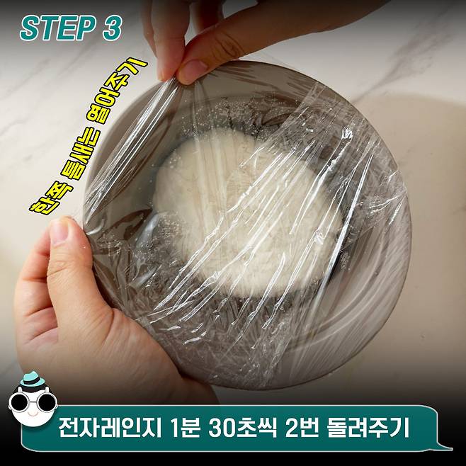 반죽이 담긴 볼에 랩을 한번 씌워준 뒤 1분 30초 전자레인지에 돌려주세요. 이때 한쪽 틈새는 살짝 떼어주기!