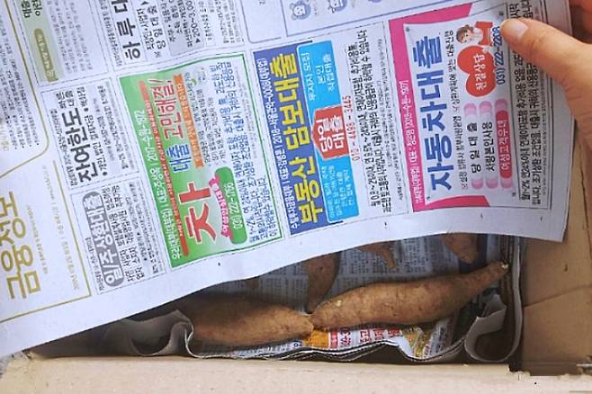 이제 박스에 고구마를 넣어주시는데요. 박스에 신문지를 한 장 깔고 그 위에 고구마를 띄엄띄엄 올려주세요. 신문지가 습기를 잡아주고 고구마끼리 공간을 두면 더 오래갑니다.