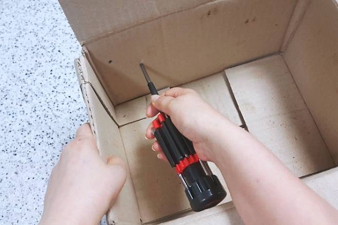 고구마 물기가 다 마르면 다시 박스에 넣어야 하는데요. 이때 그냥 담지 마시고 박스 옆면에 드라이버로 구멍을 몇 군데 뽕뽕 뚫어 주세요