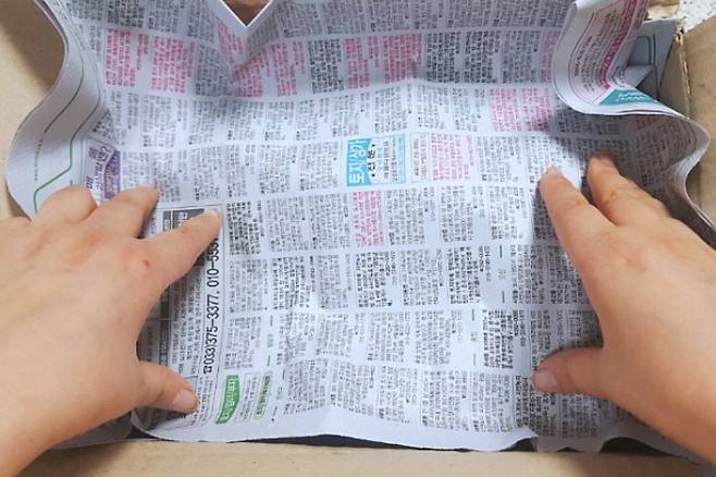고구마가 다 차면 신문지로 잘 덮어주세요. 혹시 박스가 없다면 구멍 뽕뽕 뚫린 바구니로 이렇게 해 주시면 됩니다.