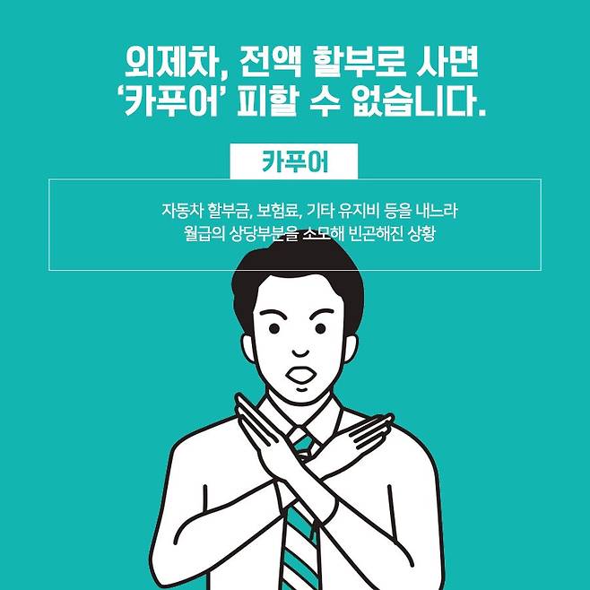 이런 금융상품을 이용해 수입차를 구매하는 젊은 층들이 많아졌는데, 이들은 받는 월급의 상당수를 차량 구매를 위한 카드 할부나 대출금 상환에 사용한다. 결국 정말 써야 할 곳에 돈을 못 쓰고 저축이나 재테크 등도 못하면서 차 한 대만 갖고 빈곤한 삶을 사는 ‘카푸어’들도 늘어나고 있다.