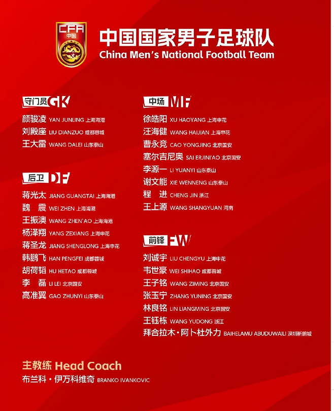 이반코비치 감독이 이끄는 중국 축구대표팀은 16일(한국시간) 저녁 오는 21일과 25일 열리는 사우디아라비아, 호주와의 2026 국제축구연맹(FIFA) 북중미 월드컵 아시아 지역 최종예선 7차전과 8차전에 나설 대표팀 선수 소집 명단을 발표했다.