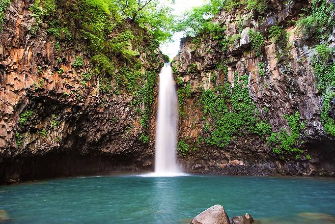 또한 검은 현무함 중상절리 아래로 떨어지는 물줄기가 아름답기로 유명하여 제주도 천지연폭포와 비견되기도 한 장소랍니다.