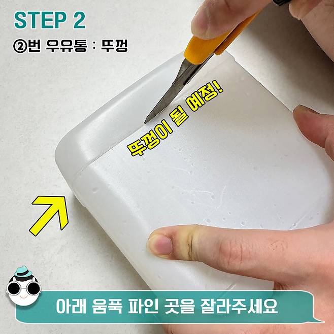 일단 우유 포장 라벨을 뜯고 나면 중간 부분에 움푹 파인 곳이 보일 거예요. 첫 번째 우유통의 그 부분을 칼이나 가위를 이용해 잘라줄게요.