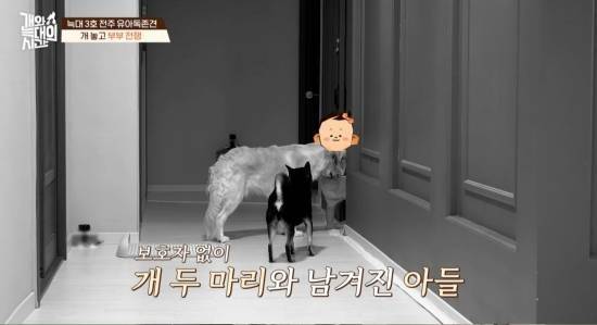 아이와 있을 때는 어떨까. 엄마가 잠시 안방에 들어가자 늑대 3호와 리트리버는 눈치를 보기 시작했다. 그런데 정작 울타리를 넘은 건 늑대 3호가 아니라 리트리버였다. 소파 위로 피신한 아기에게 다가가더니 손에 들린 과자를 뚫어져라 쳐다봤다. 아기가 거부하듯 손사래를 쳤지만, 한 치도 물러서지 않았다. 조마조마한 긴장감이 흘렀다. 강형욱은 도저히 못 보겠다는 표정을 지었다.
