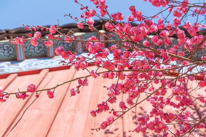 이곳의 홍매화는 2월 말부터 3월 중순 사이에 피어나며, 따뜻한 해가 들면 금세 절정에 이르곤 합니다. 기와지붕과 단청 장식 사이로 붉게 피어난 매화는 매해 사진가들과 여행객의 발길을 사로잡습니다. 은은하면서도 짙은 향이 특징이라, 가지를 가까이에서 바라보면 살포시 풍기는 꽃내음을 느낄 수 있어 봄날의 정취를 만끽하기 좋습니다.