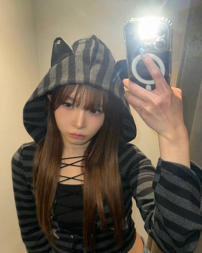 트리플에스 코토네는 스트라이프 패턴에 고양이 귀 장식이 달린 키치한 후드로 톡톡 튀는 개성을 드러냈다. 귀여우면서도 스타일리시한 이 후드는 그녀의 발랄한 분위기를 더욱 돋보이게 한다. 블랙 크롭탑과 함께 연출한 그녀의 룩은 간절기의 상큼한 매력을 충분히 살렸다. 평범한 후드가 지루하게 느껴진다면, 코토네처럼 유니크한 디자인을 선택해보는 것도 좋겠다.