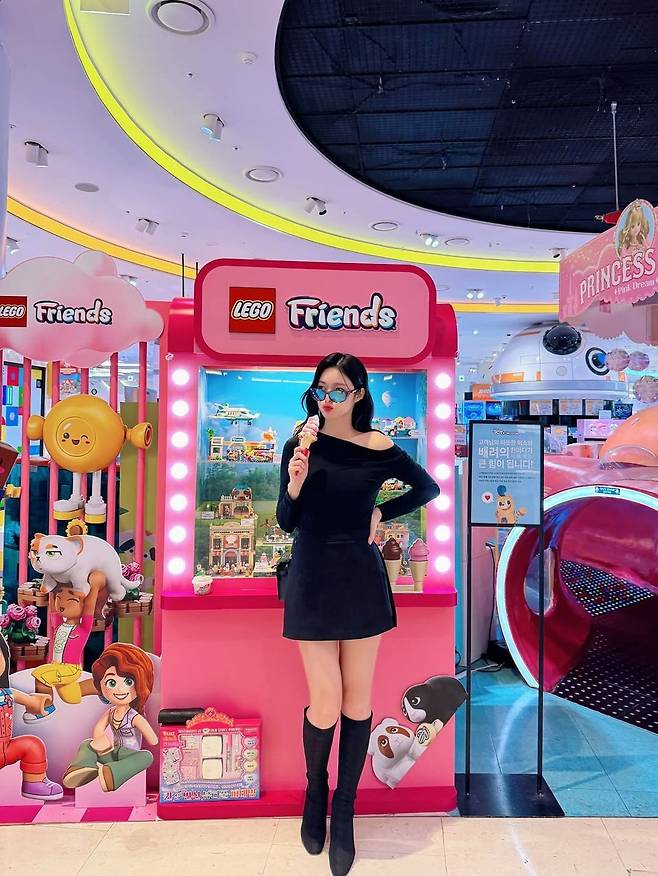 장난감보다 그녀가 더 돋보였다. 한으뜸이 올린 인스타그램 속 한 컷이 패션 피드를 점령했다. 알록달록한 레고 프렌즈 존을 배경으로 아이스크림을 들고 서 있는 그녀의 착장은 시크함과 러블리함이 절묘하게 공존하는 스타일로 눈길을 끈다.