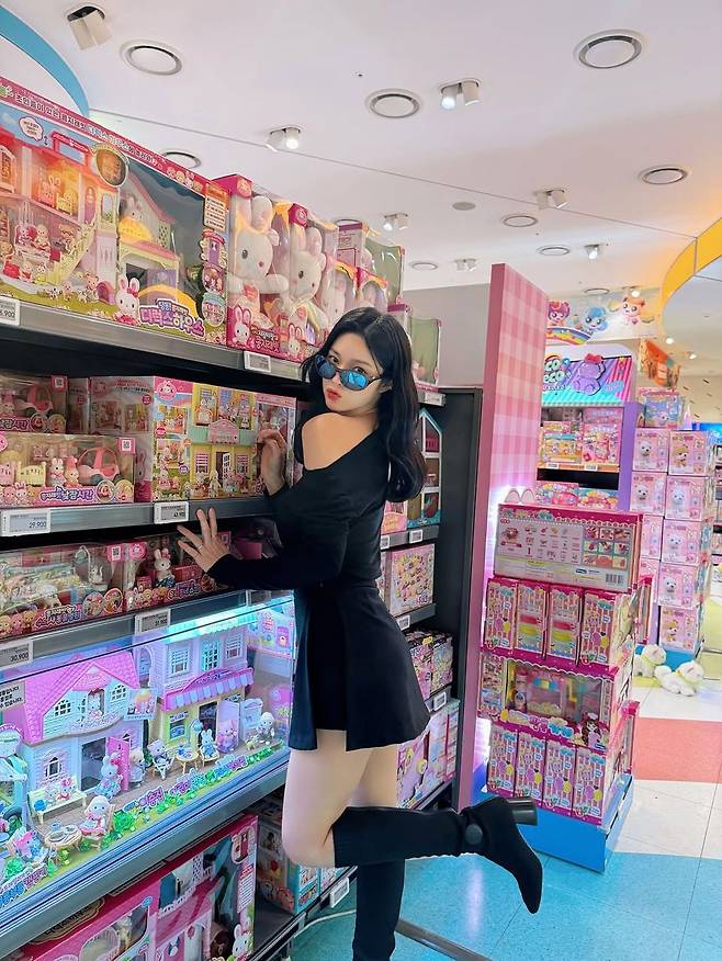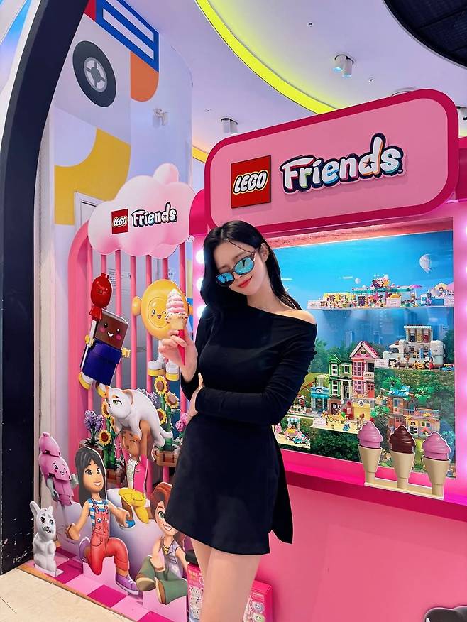 또한 그녀는 컬러 렌즈가 들어간 오버사이즈 선글라스를 착용해 유쾌한 놀이공원 무드를 더했다. 강렬한 블랙룩에 포인트 소품으로 캐주얼함을 얹은 연출이 신의 한 수처럼 느껴진다. 배경 속 핑크와 형형색색의 레고 캐릭터들과 대비되는 그녀의 다크한 착장이 오히려 더 강렬하게 시선을 붙잡는다.