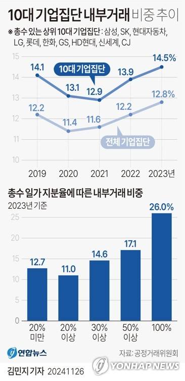 (서울=연합뉴스) 김민지 기자 = 26일 공정거래위원회가 발표한 '공시대상기업집단 내부거래 현황'에 따르면 총수가 있는 상위 10대 집단(삼성, SK, 현대자동차, LG, 롯데, 한화, GS[078930], HD현대[267250], 신세계[004170], CJ)의 국내 계열사 간 내부거래 비중은 14.5%로 공시대상기업집단 전체의 내부거래 비중(12.8%)보다 1.7%포인트(p) 높았다.