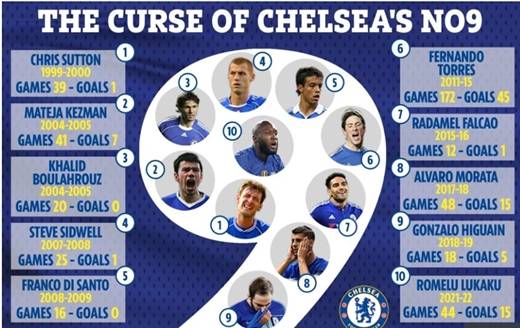 전임 구단주인 로만 아브라모비치가 첼시를 인수한후 19년 동안 9번을 입은 선수는 7명이다. 전부 이름이 알려진 스트라이커였다.
