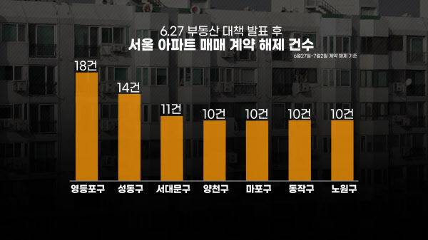 국토교통부 실거래가 공개시스템에 따르면, 대출 규제 발표일인 6월 27일부터 7월 2일까지 닷새간 서울 아파트 매매 계약 해제 건수는 164건으로 집계됐다. 영등포구가 18건으로 가장 많았고, 성동구(14건), 서대문구(11건), 노원·동작·마포·양천(각 10건) 순이었다. 자치구별로 골고루 해제 사례가 확산된 가운데, 강남권은 크게 흔들리고 있다.