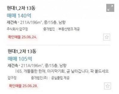 최근 급등을 주도했던 압구정도 예외는 아니다. 대출 규제 시행 직후, 네이버부동산에는 현대1·2차 아파트 13동 전용 196㎡의 호가가 140억원에서 105억원으로 4일 만에 35억원 하락했다는 정보가 등록됐다. 부동산 커뮤니티에서는 이를 두고 “대출 규제 직격탄”이라는 해석이 나왔으나, 현장 취재 결과 해당 매물은 허위로 확인됐다. 인근 중개사들은 “매수 문의가 급감한 것은 사실이나, 아직 실거래가가 그렇게 떨어진 사례는 없다”고 전했다.