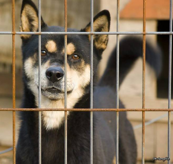 잿빛, 즉 회색 털을 가지고 있는 진돗개입니다. 하얀색, 검은색, 노란색 세 가지 색이 섞여 회색빛을 띠게 되는데요.