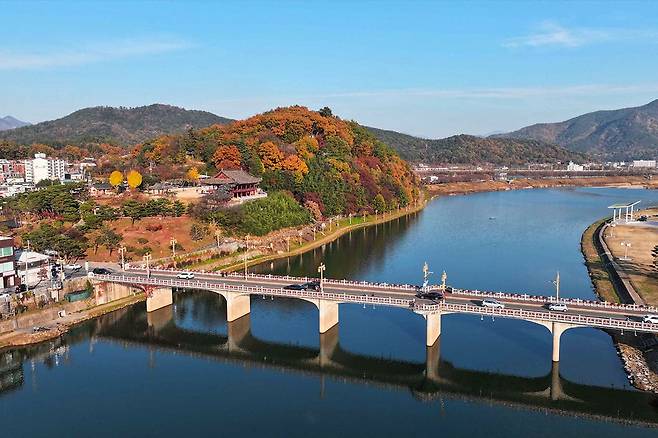 영남루에서 내려다보는 밀양강의 풍경은 가을의 정취를 한껏 느끼기에 충분합니다.