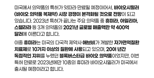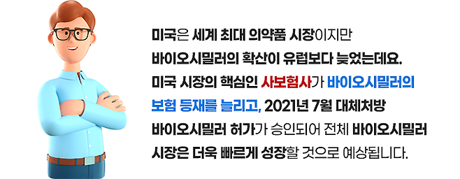 의약품 특허 만료는 오리지널 제약사에는 위기지만, 바이오시밀러 회사에는 기회일 수 있습니다. 특히, 바이오시밀러는 오리지널 바이오 의약품의 효능은 유지하면서 적은 비용으로 비교적 짧은 시간 내에 개발이 가능해서 의약품의 가격 부담을 줄일 수 있기 때문에 세계 각국의 수요도 계속해서 확대되는 추세입니다.