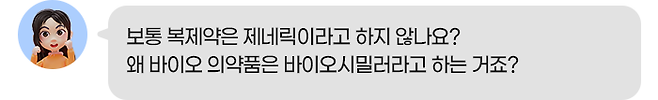 제네릭은 화학적인 합성을 통해서 동일한 구조로 만들어지는 복제약을 말합니다. 하지만, 바이오 의약품은 개발사마다 살아있는 세포를 생성하는 조건, 정제 방법이 다르기 때문에 똑같이 만들 수는 없습니다. 그래서, 바이오 뒤에 ‘시밀러’라는 단어를 붙이는 것이죠.