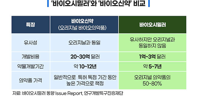 신약 개발에 20~30억 달러가 쓰인다면, 바이오시밀러 개발에는 1~3억 달러가 쓰인다고 합니다. 가격 역시 오리지널 바이오 의약품의 50~80% 정도로 환자들에게 값비싼 의약품을 상대적으로 저렴한 가격에 제공할 수 있습니다.
