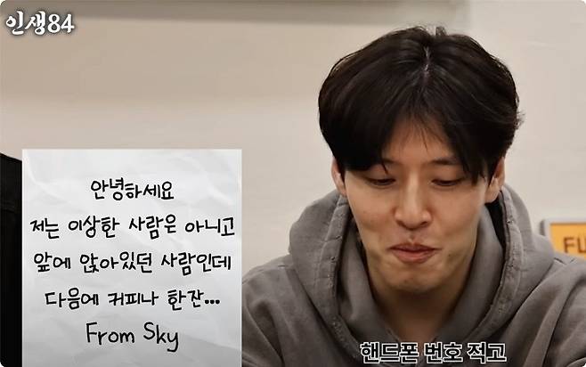 쪽지 내용: “전 이상한 사람이 아니고 앉아있는 사람인데 괜찮다면 다음에 시간 날 때 커피 한잔할 수 있을까요?”
