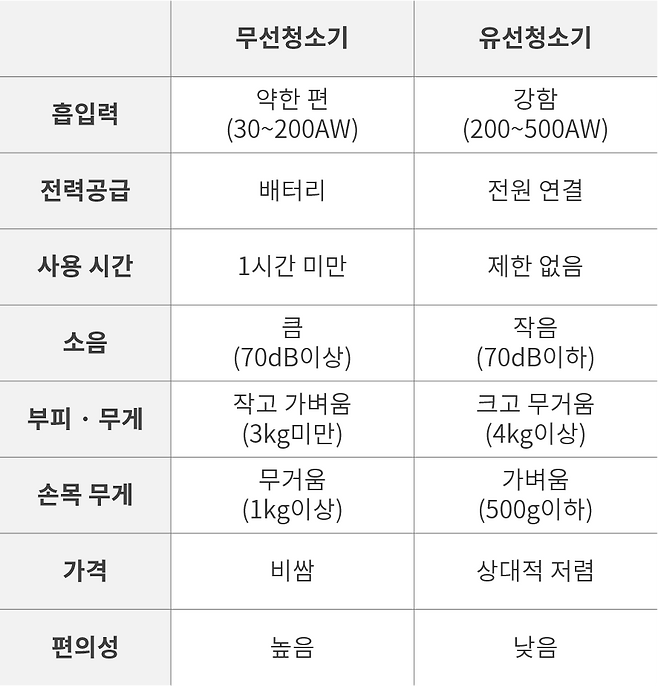 위 표는 무선청소기와 유선청소기의 성능을 보기 쉽게 정리한 표입니다. 흡입력, 사용 시간, 소음, 무게 그리고 가격 부문에서 유선청소기가 더 우세하다는 것을 알 수 있습니다.