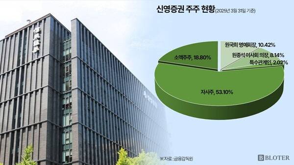 11일 금융감독원에 따르면 신영증권의 자사주 보유 비중은 올해 3월 말 기준 53.1%다. 반면 원국희 명예회장은 10.42%, 그의 장남인 원 의장은 8.14%로 이들을 포함한 친인척 합산 특수관계인의 지분율은 20.58%에 불과하다. 이외에 소액주주 비중은 18.8% 정도다.