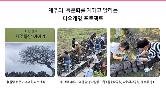 그동안 바래왔던 돌담 축조 기술 교재를 제작하고, 돌담 봉사활동 <다우게양>도 더불어 진행할 수 있었던 뜻 깊은 시간이었습니다. 앞으로 제주 돌 문화를 지속적으로 알릴 수 있도록 문수동과 돌 자파리 행사를 정기적으로 개최하려고 하며, 돌 문화를 함께 즐길 수 있는 ‘돌챙이 합창단, 어린이 돌놀이, 돌담 사진찍기’와 같은 문화프로그램을 개발할 예정입니다.