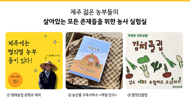 생태농업 농산물 구독 서비스로 기획한 <계절 친구>는 생태 농업 콘텐츠 제작 시 인터뷰로 확보한 제주 도 내 생태 농부들의 농산물을 담은 계절 농산물 꾸러미 서비스입니다. 꾸러미 발송을 위한 패키지 개발 및 농산물과 함께 판매할 굿즈를 제작했습니다. 사업 기간 중 <계절친구 - 가을, 겨울편> 을 만들어 11월에 가을편 10개를, 12월에 겨울편 20개를 발송했습니다.