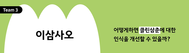 이삼사오는 20대부터 50대까지 다양한 연령대가 함께 팀이 되었다는 뜻으로 지역 사회 문제에 다양한 관점과 아이디어를 가진 팀입니다. 제주도의 분리수거장인 <클린하우스>의 근로자분들의 열악한 근로 환경을 발견하고, <클린삼춘>인식 개선 프로젝트를 진행하고 있습니다.