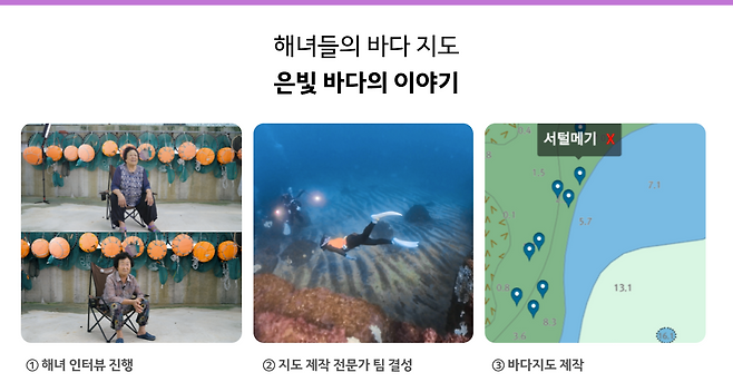 바다라는 특성에 따라 해녀팀/수중다이빙팀/지도제작팀/촬영팀으로 전문가 그룹을 구성하였습니다. 이렇게 분야 전문가와 함께 구체적인 지도제작 솔루션, 제작 과정, 촬영기록, 일정 등을 협의하며 지도 제작 준비를 했습니다.