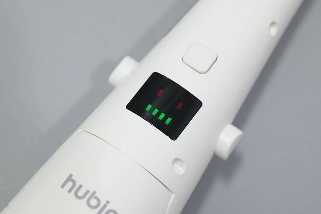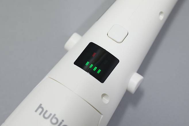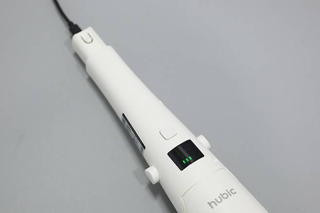 휴빅 욕실청소기 HB-200W의 사용 전에 우선 충전 과정이 필요하다. 손잡이를 제거한 후 충전 케이블을 연결하면 본체 가운데에 있는 디스플레이에 녹색 막대가 점멸하면서 충전이 진행된다.