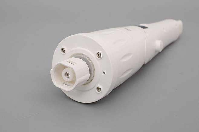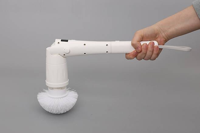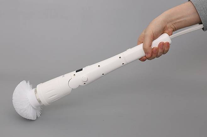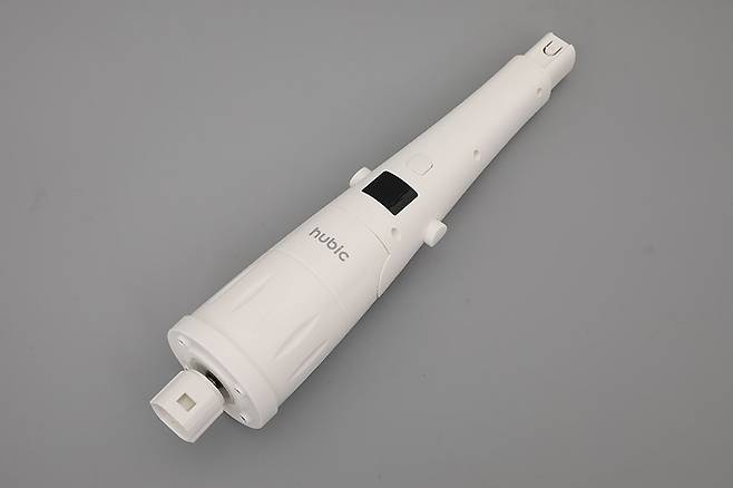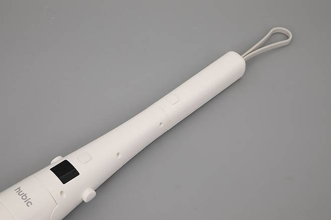 휴빅 욕실청소기 HB-200W의 본체 윗부분 충전 단자가 있는 곳에 손잡이를 끼우면 좀 더 완벽하게 사용할 수 있는 상태가 된다. 손잡이 끝부분에는 밴드가 달려 있어서 벽에 걸어둘 수도 있다.