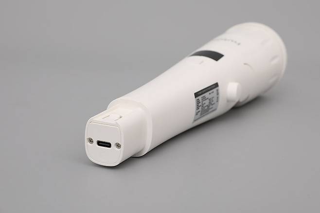 본체 위쪽 끝부분에는 충전 단자가 있다. 충전 단자는 USB C타입으로, 스마트폰 충전 케이블을 함께 사용할 수 있지만 고속 충전 어댑터는 사용할 수 없다.